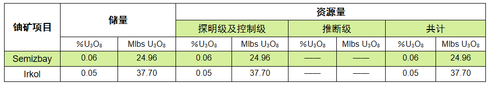 2015年中廣核礦業(yè)完成哈薩克斯坦謝米茲拜伊鈾有限合伙企業(yè)49%股權(quán)的收購,并獲得旗下兩座在運(yùn)營鈾礦山(謝米茲拜伊鈾礦床和伊爾科利鈾礦床)49%的天然鈾產(chǎn)品包銷權(quán),成為一家主業(yè)清晰的鈾資源開發(fā)和貿(mào)易公司。 謝米茲拜伊有限合伙企業(yè)的架構(gòu) 謝米茲拜伊鈾礦床 謝米茲拜伊鈾礦井場(chǎng) 謝米茲拜伊鈾礦現(xiàn)場(chǎng)鉆探 謝米茲拜伊鈾礦產(chǎn)品液加工車間 伊爾科利鈾礦床 伊爾科利鈾礦辦公樓 伊爾科利鈾礦產(chǎn)品液加工車間 伊爾科利井場(chǎng) 資源量及儲(chǔ)量(2021.12.31)